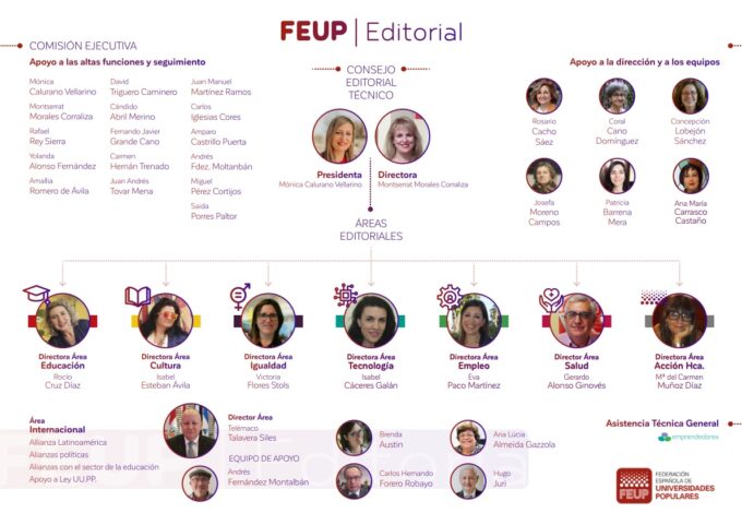 El Equipo Editorial, encabezado por la Directora General de la Editorial FEUP, Montserrat Morales Corraliza, junto a las Directoras y Director de Áreas: María Rocío Cruz Díaz (Educación), Isabel Esteban Ávila (Cultura), Isabel Cáceres Galán (Tecnología), Eva Paco Martínez (Empleo), Gerardo Alonso Ginovés (Salud) y María Carmen Muñoz Díaz (Acción Histórica-Sostenibilidad), protagonizaron un momento histórico para la FEUP con la presentación oficial de esta gran obra de inteligencia colectiva.
